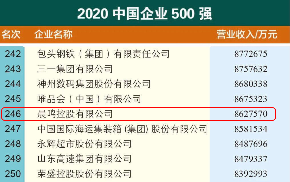 9月27-28日,由中國企業(yè)聯(lián)合會(huì)、中國企業(yè)家協(xié)會(huì)主辦的第19屆“2020中國500強(qiáng)企業(yè)高峰論壇”在河南鄭州召開,備受矚目的“2020中國企業(yè)500強(qiáng)”榜單正式發(fā)布,晨鳴控股排名第246位,位居行業(yè)榜首。在同期發(fā)布的“2020中國制造業(yè)企業(yè)500強(qiáng)”榜單中,晨鳴控股位列107位。